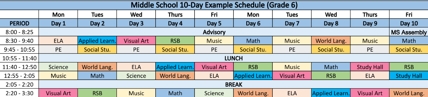- 初中课程初中生每年学习9个学科: 数学、科学、英语、社会研究、体育、世界语言、STEM、精神内省(RSB)和艺术。